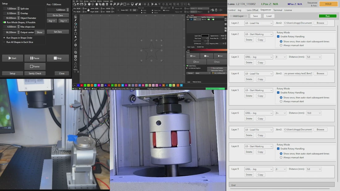 Quick demonstration showing it's possible to have Z axis movement, mark with LightBurn and retain your rotary with a BJJCZ Lite based system. Additional X and Y axis capability as well: